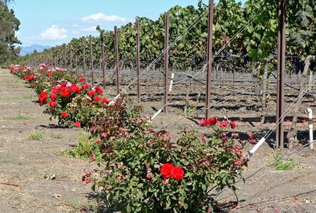 Is there a purpose to growing roses in a vineyard? Does it look pretty? Yes. Do they attract bees for pollination? Probably. The real function is that Roses are very susceptible to mildew which signals the vintner to treat his vines A.S.A.P. Today, however, spraying regimes and techniques are such that roses are not as essential as in the years past.