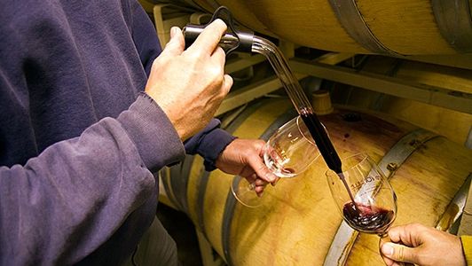 It takes a thief to get wine out of a barrel. This is a glass tube with an aperture at its pointed base and one at the top with an elbow or swan so the wine can be transported horizontally. The Winemaker submerges the tube into the wine and when a desired level is achieved, he/she places his/her thumb over the hole at the top and creates a vacuum keeping the wine inside, like a pipette. When over or in a desired vessel, the thumb is released and so is the wine. In wineries all over the globe, thieves are always good to have around.